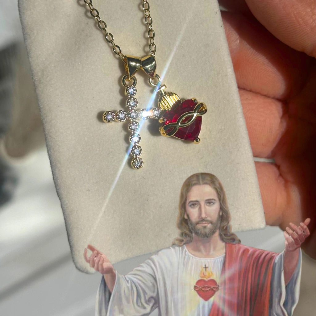 COLLAR CRUZ RELIGIOSA Inspírate y lleva contigo la fe con este elegante collar cruz, diseñado en honor al Sagrado Corazón de Jesús y a Cristo Rey. Una pieza que combina significado y estilo para complementar cualquier atuendo.